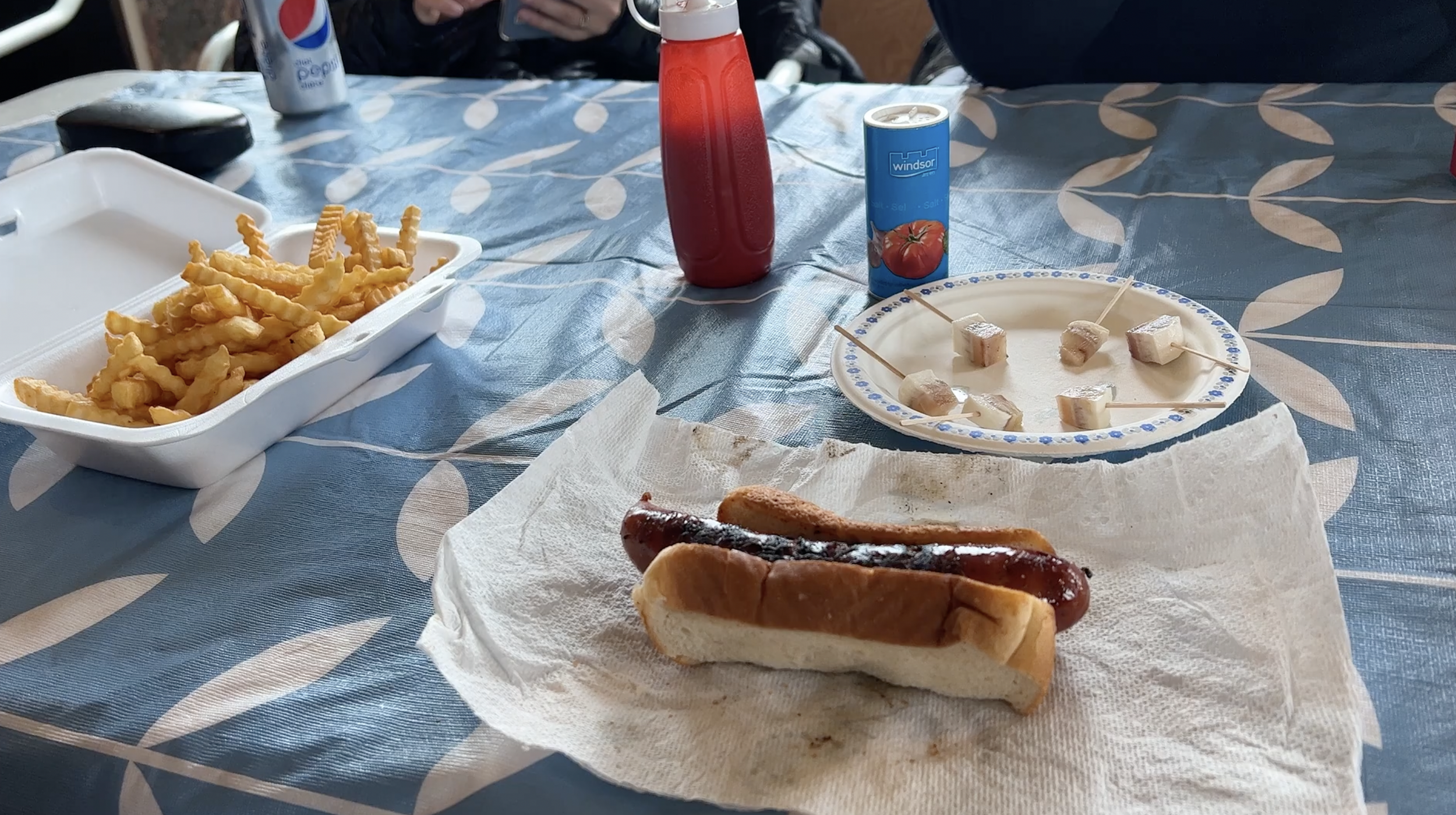 One order is served as six pieces cut into cubes roughly 1cm in size, speared with a toothpick. Commonly, it’s dipped in either HP sauce or ketchup, similar to french fries. Its taste is something very unique and surprisingly delicious, not nearly as rubbery or as chewy as we expected, considering it’s primarily fat. While finishing our small serving of Muktuk, we chatted more with our newfound friends, comparing travel notes, hopeful goals, and destinations we wanted to experience.