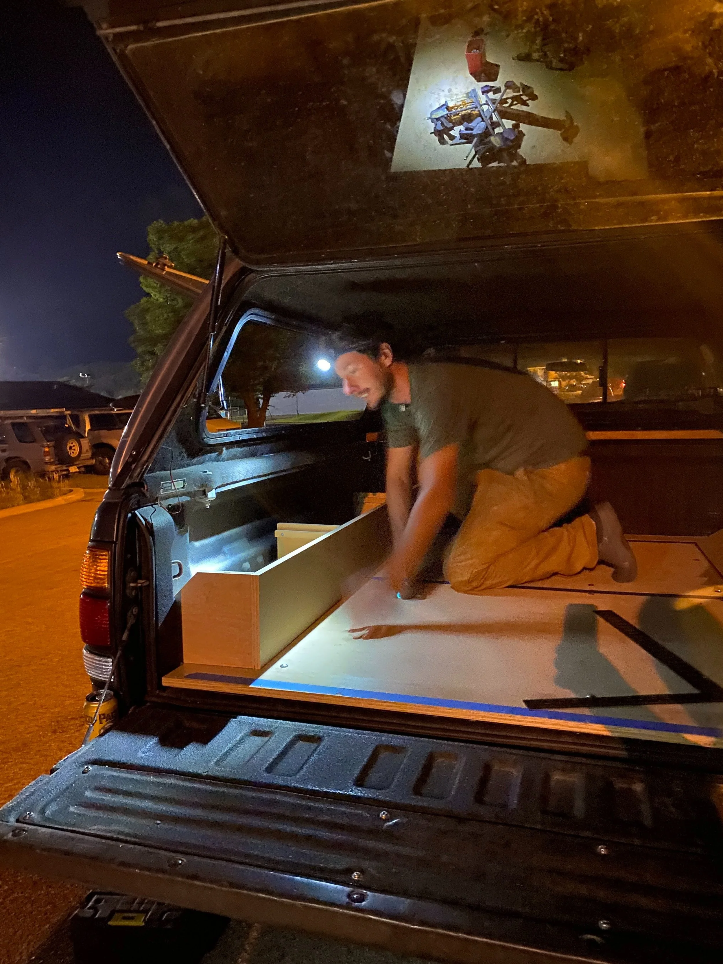 Drawer assembled and being loaded with gear on the evening before we left Colorado to drive to Maine. In the continued name of simplicity the drawer simply slides along the floor of the build with the aid of drawer slide bees wax. We did this in favor of drawer slides so that we could keep the drawer as wide as possible and to reduce some weight.