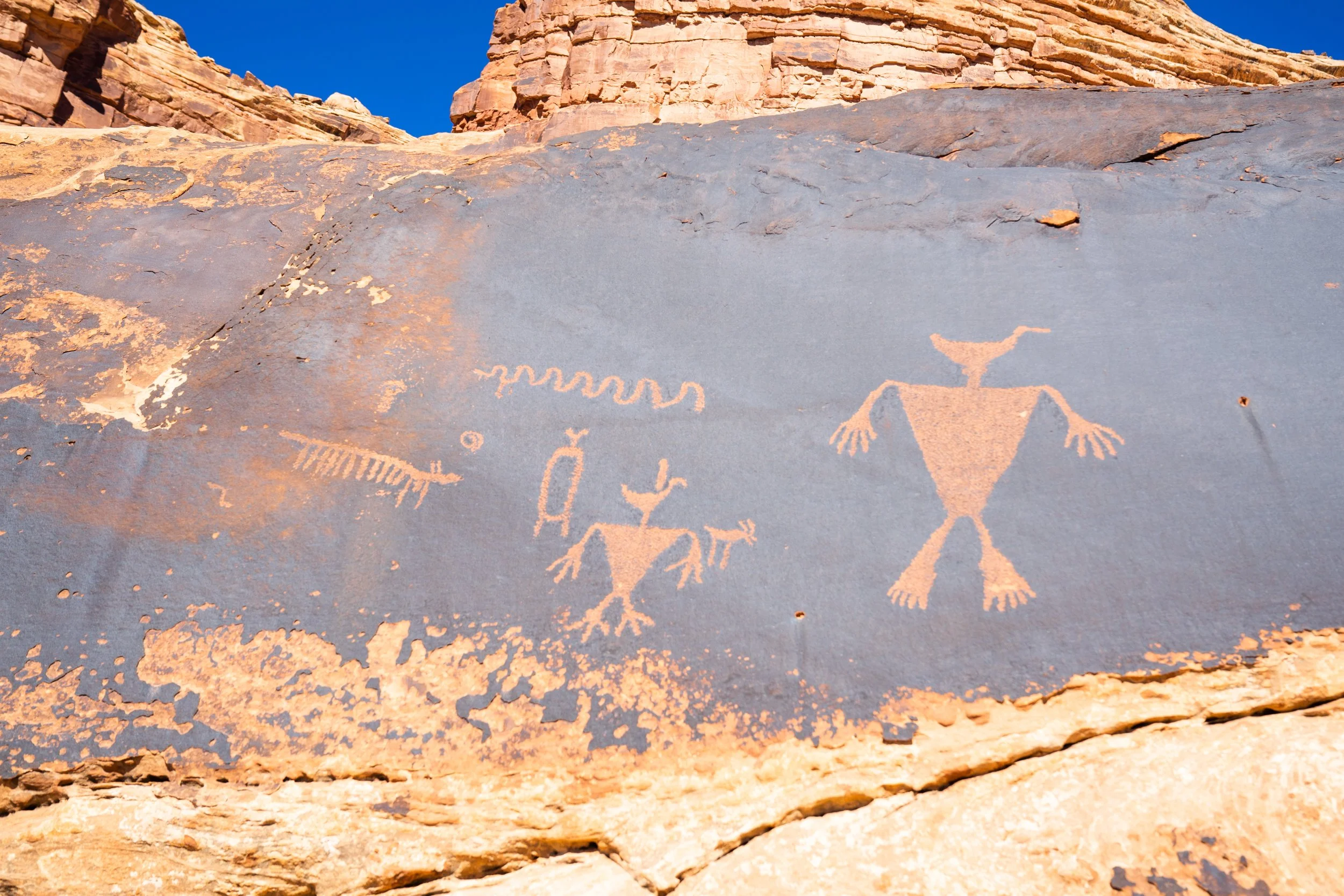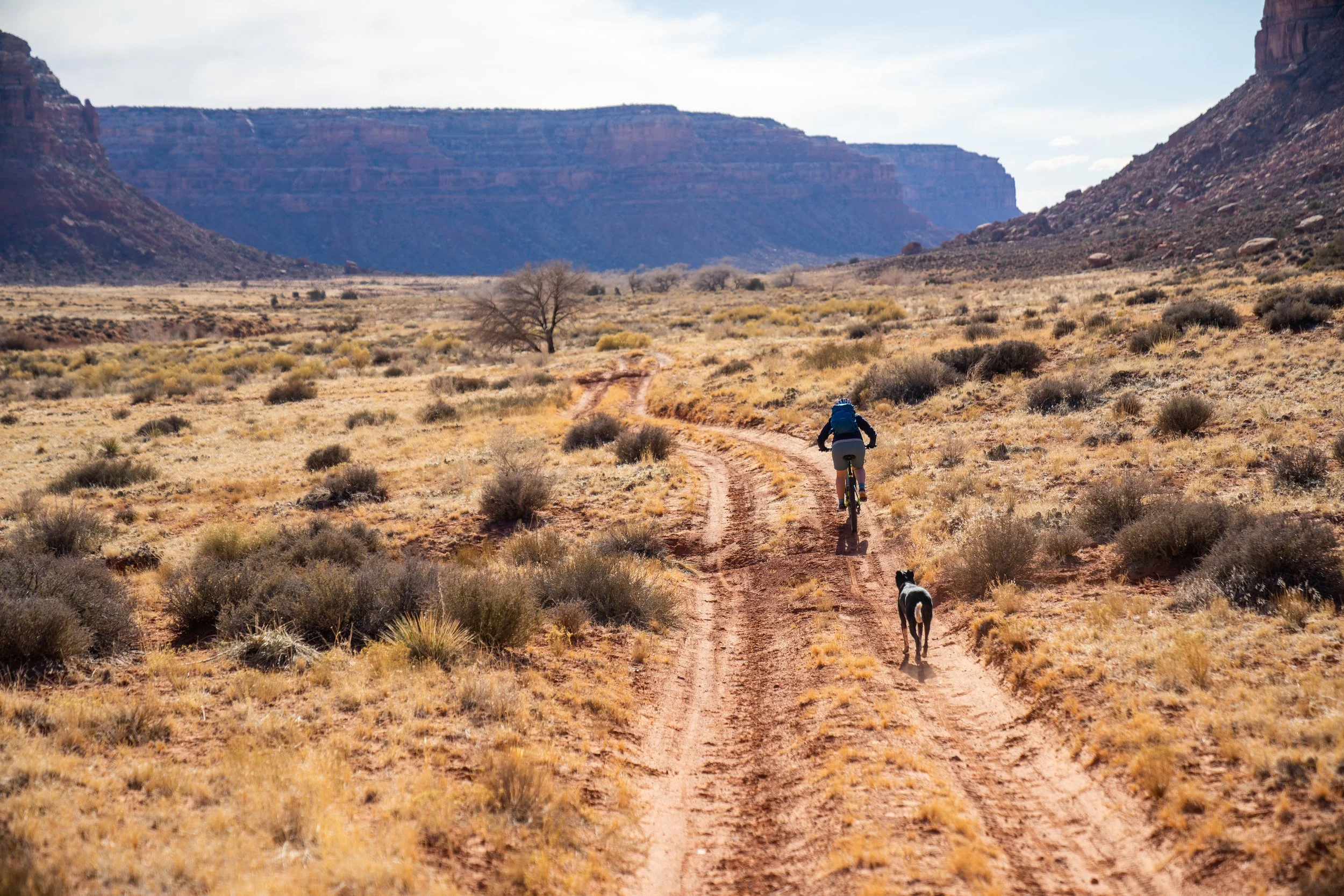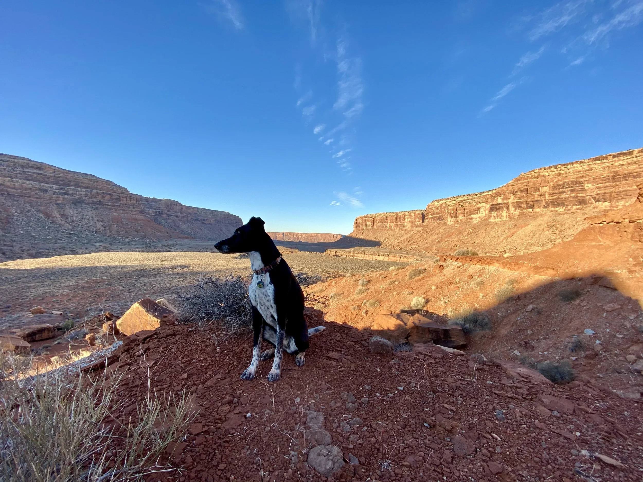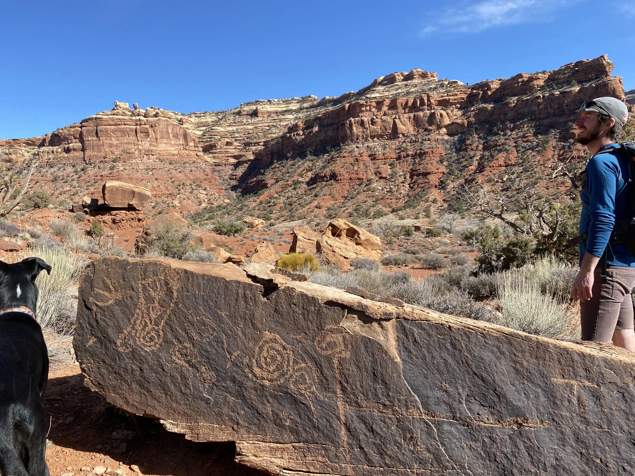 There was an offshoot from the dirt road where we were camped that continued further up a drainage where we hoped to find some ancient petroglyphs. We left Peanut at camp and set off on our bikes with a happy Greta dog to run along side us.