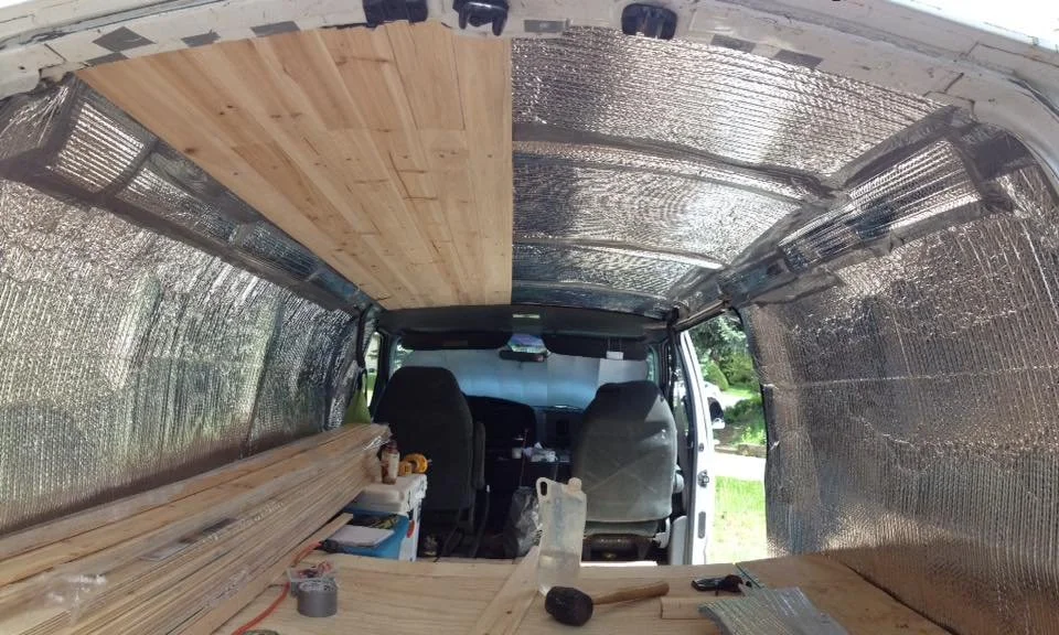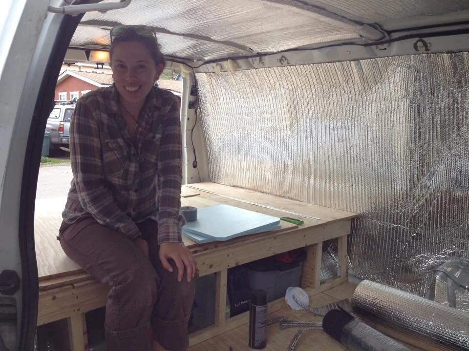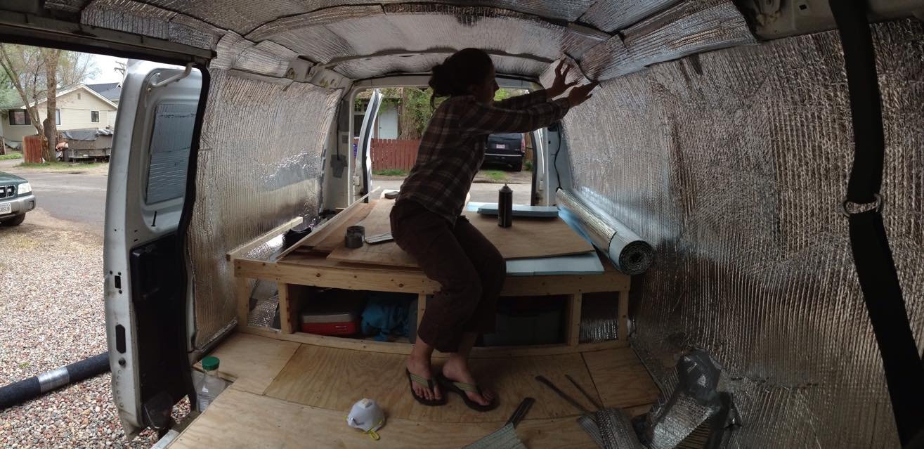 Christina continuing to glue and place Reflectix along the walls and ceiling.