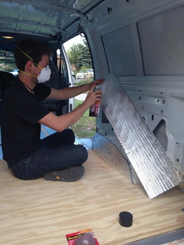 Here Brian is using spray adhesive to apply Reflectix to the wheel wells to help with insulation.