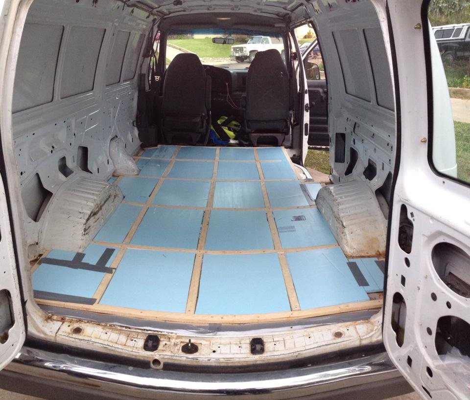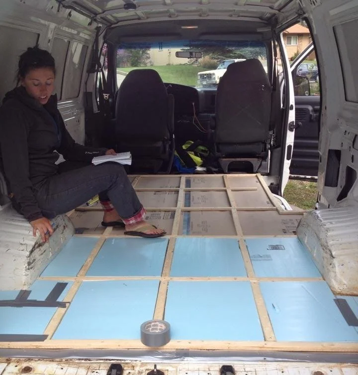 We framed out a subfloor with 1x1s which we screwed into the metal studs of the van.