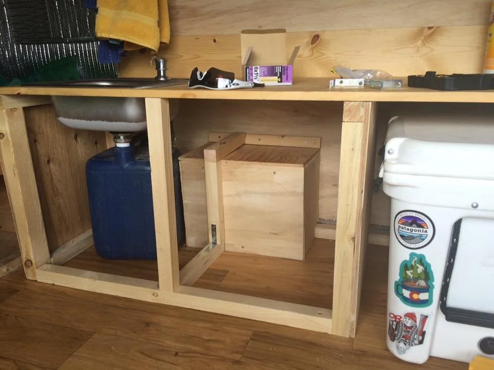 Framing out our very basic kitchen build with 1x1s and 1/4 inch plywood. The space on the right was sized to fit our cooler exactly. We laid and stapled our linoleum flooring down in the front half of the van (everywhere except under the bed).