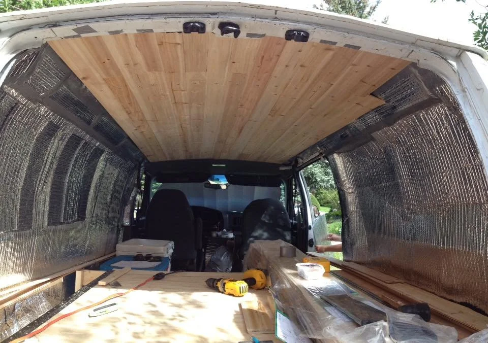 We decided to panel the ceiling with cedar tongue and groove planks which we screwed into the studs of the frame of the van.