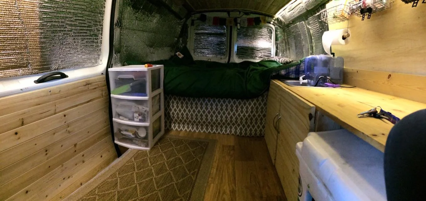Our humble first van build out didn’t turn out half bad! We always said that we would cover the Reflextix on the walls but somehow never got around to it.